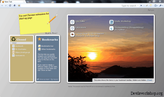 I am using this extension for a couple of days and I quite like the new start up page. It is simple and not too complicated to many features all packed in. Do try out this extension and write in your comments with any similar tips you have with other browsers. Link: Incredible State Page for Chrome Cheap Domain name | Dreamhost Wp Hosting 50$ discount This Post Get a productive start page for Chrome is Published on Devils Workshop .Related posts: |