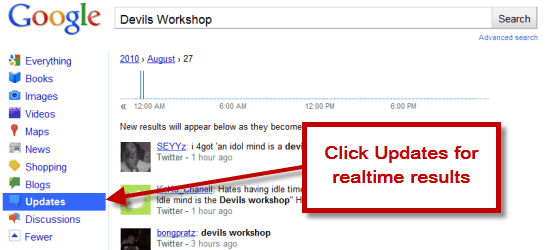 Google realtime results looks like a cool service but it is showing a lot of results from Twitter. I might just use Twitter search instead. Try out Google Realtime search and drop in your views through your comments. -- This Post Get real time search results with Google is Published on Devils Workshop . Related posts: