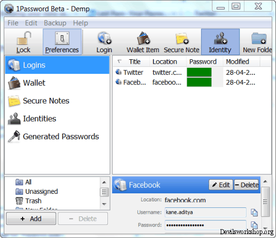 With 1Password I could create key-chains which are groups of user-names and passwords for various websites. For example I have personal and professional accounts for Facebook, Email and Twitter. I could save the key-chain as a file and sync it with Drop-box so when I went to my office I could retrieve all my accounts I wanted with the key-chain file at my work station. If you liked this post you might also want to read about Last Pass which is also another password manager we have reviewed on DW. Download 1Password for Windows and let me know your views on it through your comments. Link: Lifehacker Cheap Domain name | Dreamhost Wp Hosting 50$ discount This Post Manage your passwords on Windows and collaborate them with Dropbox is Published on Devils Workshop .Related posts: