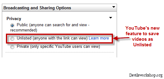 YouTube has really ratcheted up its design and features to allow for better sharing and viewing of videos. This one feature will make people use it more often for personal videos. So what do you think about unlisted videos? Will you be using them? Do drop in your comments. Cheap Domain name | Dreamhost Wp Hosting 50$ discount This Post YouTube allows videos to be unlisted is Published on Devils Workshop .Related posts: |