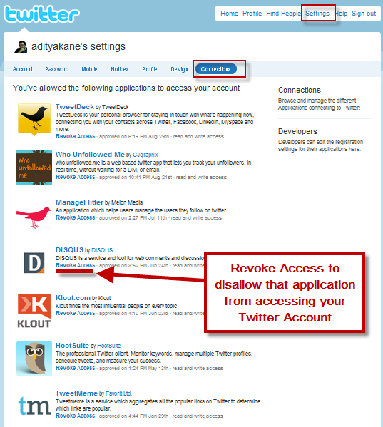| Disable third party apps from your Twitter account Posted: 03 Sep 2010 01:48 AM PDT Twitter recently announced that 3rd party applications will no longer be allowed to store your user-name and passwords. Even though applications will not save the password, it can still be used to access your Twitter account even if you change the password. This happens with the OAuth service which requires to sign in only once for a third-party app. This means potentially all the apps you have used for Twitter can access your account. Twitter has settings which allows controlling which app is allowed to access your Twitter account details. How to revoke access for certain Apps?