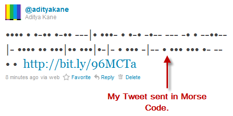 From a practical point of view I do not think it serves any purpose except it would be fun to send some secret tweets to people who do not know about this. Well I guess if you are reading this post, the secret is out. If you liked this post you might want to check some other interesting Twitter based services which allow Do drop in your comments and views. Link: Morse Tweet -- This Post MorseTweet: Twitter meets the telegraph! is Published on Devils Workshop . Related posts: |
