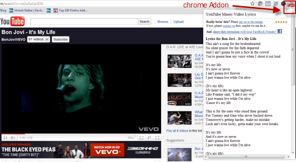 | Chrome extension to get lyrics to a song on YouTube Posted: 27 Nov 2010 03:50 AM PST It is good to have some music while coding. Bon Jovi is one of my favorite singer. I listen to his songs though I do not understand them thoroughly. Usually I download lyrics from any popular website which comes first in my way and save it to my computer. When I watch any YouTube music video, I have to find that file in my computer, cascade windows to watch lyrics and to play video simultaneously. Now forget those old techniques. Here I tell you about how you can be free from searching lyrics on the internet, saving it to your computer, find it into the hundreds of folder to open that file again. Here is your magic wand just install Chrome extension and start enjoying the lyrics along with your favorite music video. Advantages of using YouTube Music Video Lyrics extension :