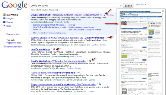 Here is the official video: Let me know whether you like this new feature Google has come up with. Drop in your comments below. Link: Google Instant Preview -- This Post Instantly Preview Websites with Google Search is Published on Devils Workshop . Related posts: |